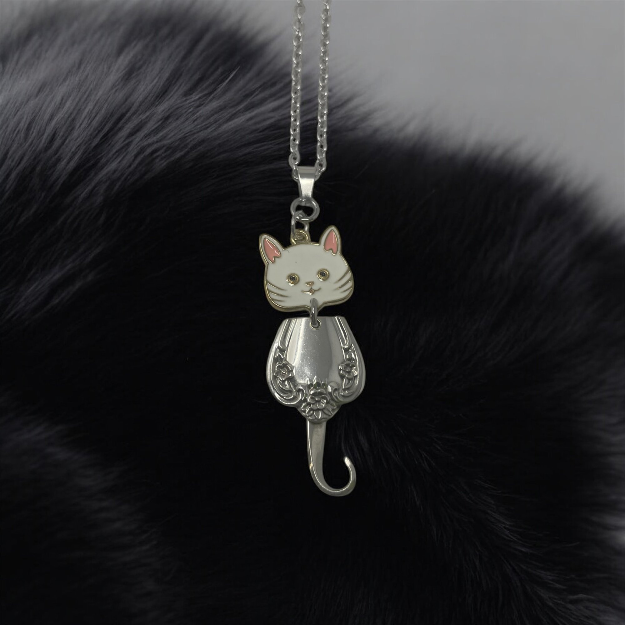 Magnolia pattern. Cat tail is tine of a fork. Displayed on a 24” stainless chain. Message for other lengths of chain.