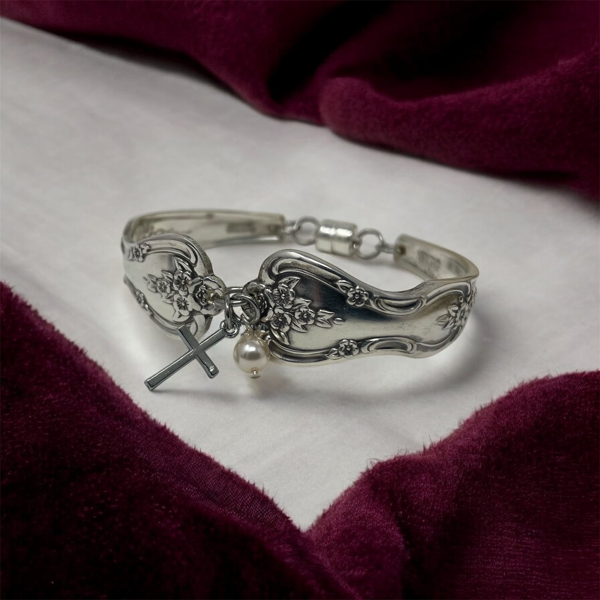 Cross bracelet using the 1951 magnolia/inspiration pattern by Rogers and Brothers. Bracelets come with a strong magnetic closure and a detachable safety chain